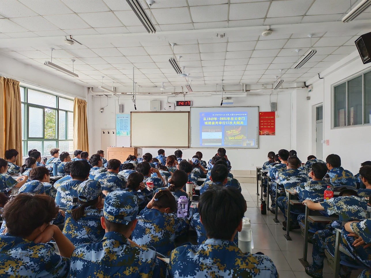 思想政治教育工作的重要组成部分,通过展现新中国成立以来17次大阅兵的宏伟画卷,为全体新生上了一堂生动的爱国主义教育课。