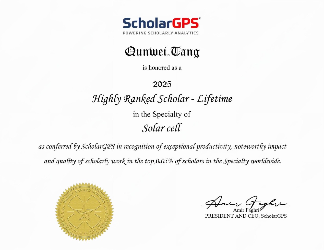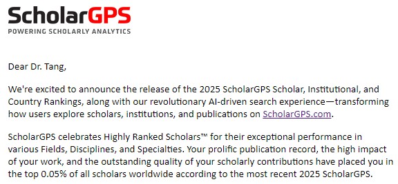 唐群委教授凭借在太阳能电池领域的卓越贡献,入选“终身榜单”(Highly Ranked Scholar - Lifetime)全球第69位。该榜单收录依据发表、影响和质量综合评估,进入全球前0.05%的顶尖学者。