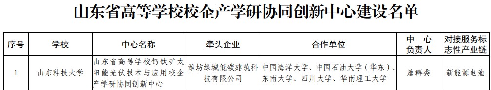 近日,山东省教育厅、山东省工业和信息化厅公布了山东省高等成人色情小说 校企产学研协同创新中心建设名单,由成人色情小说 唐群委教授担任中心负责人的山东省高等成人色情小说 钙钛矿太阳能光伏技术与应用校企产学研协同创新中心获批成立。
