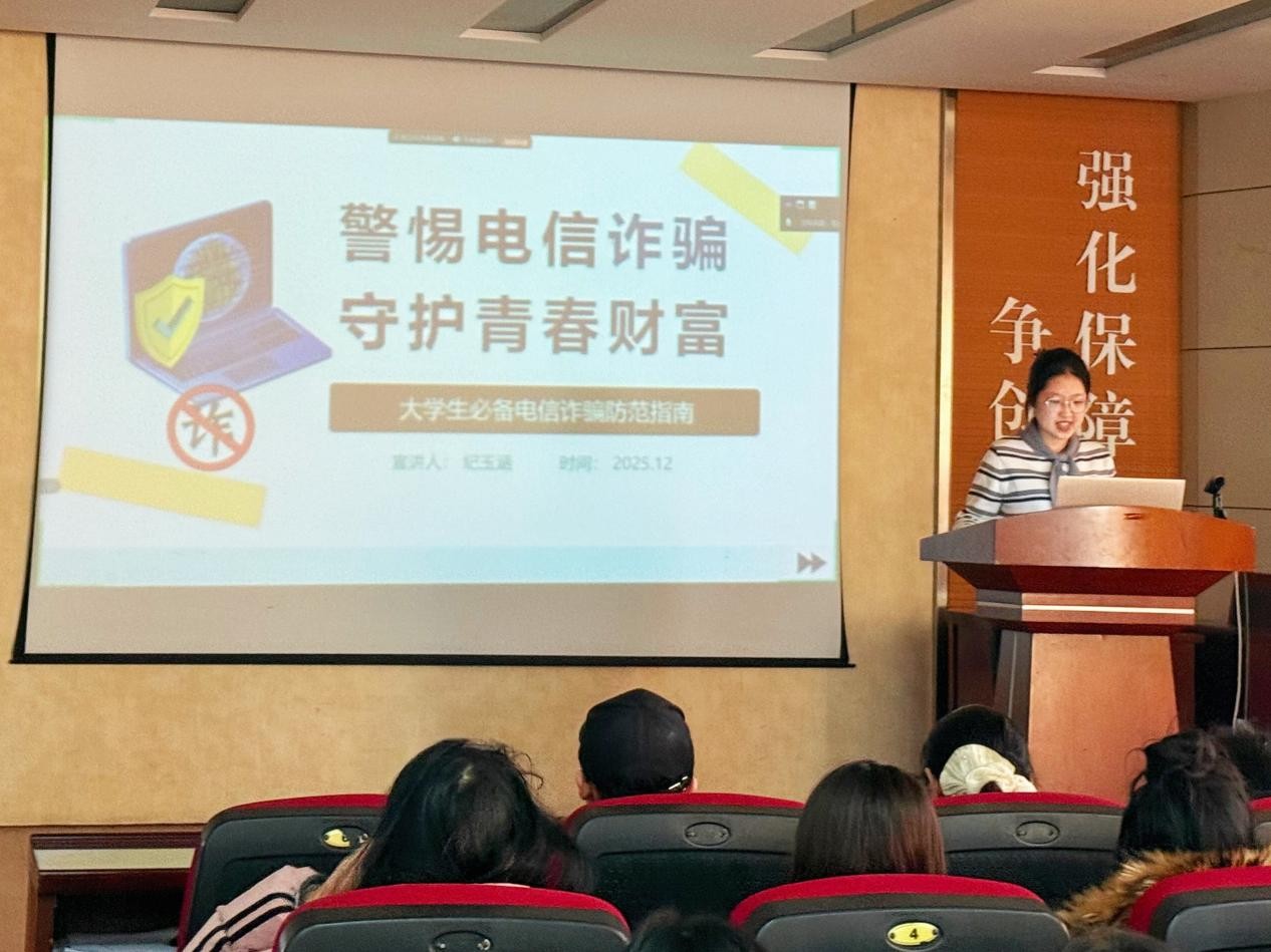 活动中,纪玉涵紧密结合大学生实际生活,通过系统讲解、互动交流等多维方式展开。围绕“常见诈骗套路”等核心板块,详细解析了冒充公检法等高发骗局。讲解中特别引入了“南京赵先生购票被骗”等真实案例,使同学们对诈骗手段的隐蔽性、话术的欺骗性及后果的严重性有了直观而深刻的认识。