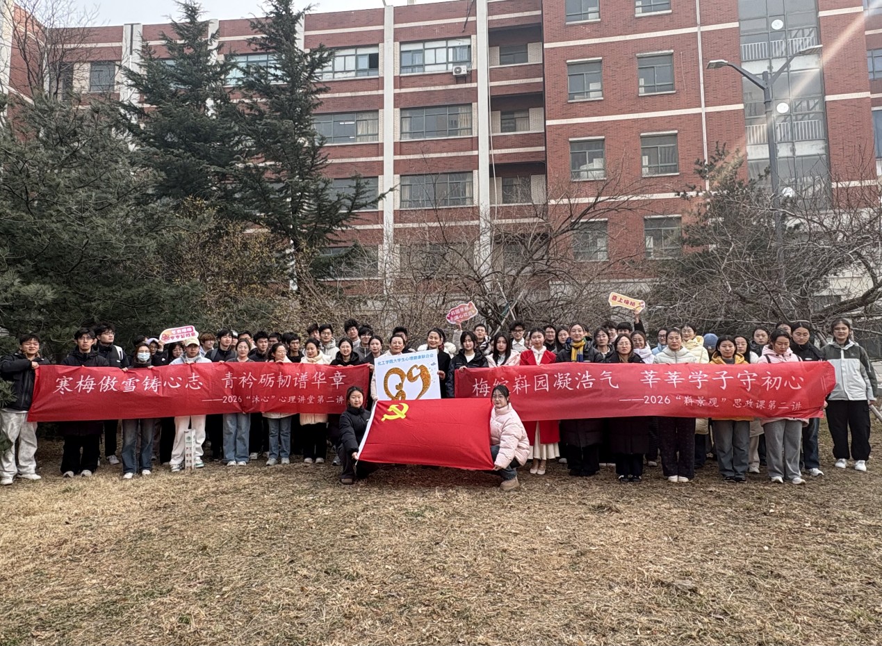 团委书记兼学工办主任易凡主持,以“梅绽嵙园凝浩气 莘莘学子守初心”为主题,特邀院心理健康负责老师李玲玲及院研究生党支部、心理健康联合会部分学生代表参与课程。在暗香浮动的园中,以梅为媒,效古人雅集之风,疏影横斜,畅叙幽情,师生携手上了一堂融合自然美育、诗词文化、红色传承与心理育人的沉浸式思政课。